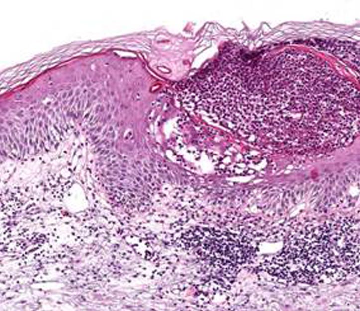 showing subcorneal pustule with neutrophils and spongiosis (H&E stain, 40x).