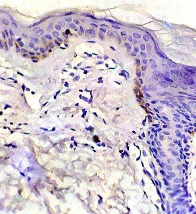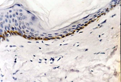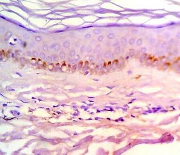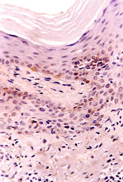 bcl-2 expression -Control skin showed weak bcl-2 immuno-reactivity as brownish cytoplasmic staining in basal layer in 2 specimens and moderate in 3 specimens (fig 4). Dermal lymphocytes were negative for bcl-2 expression in all specimens. In LP lesions, bcl-2 was weakly expressed in the basal keratinocytes as cytoplasmic and membranous brownish staining in 4 specimens and was absent in 6 specimens. On the other hand, dermal lymphocytes showed strong bcl-2 expression in all cases (fig 5). -After treatment: increased bcl-2 expression in basal and suprabasal layers was observed in all specimens while lymphocytes showed marked decrease in bcl-2 positivity in 6 samples and negative staining in 4 samples (fig 6).