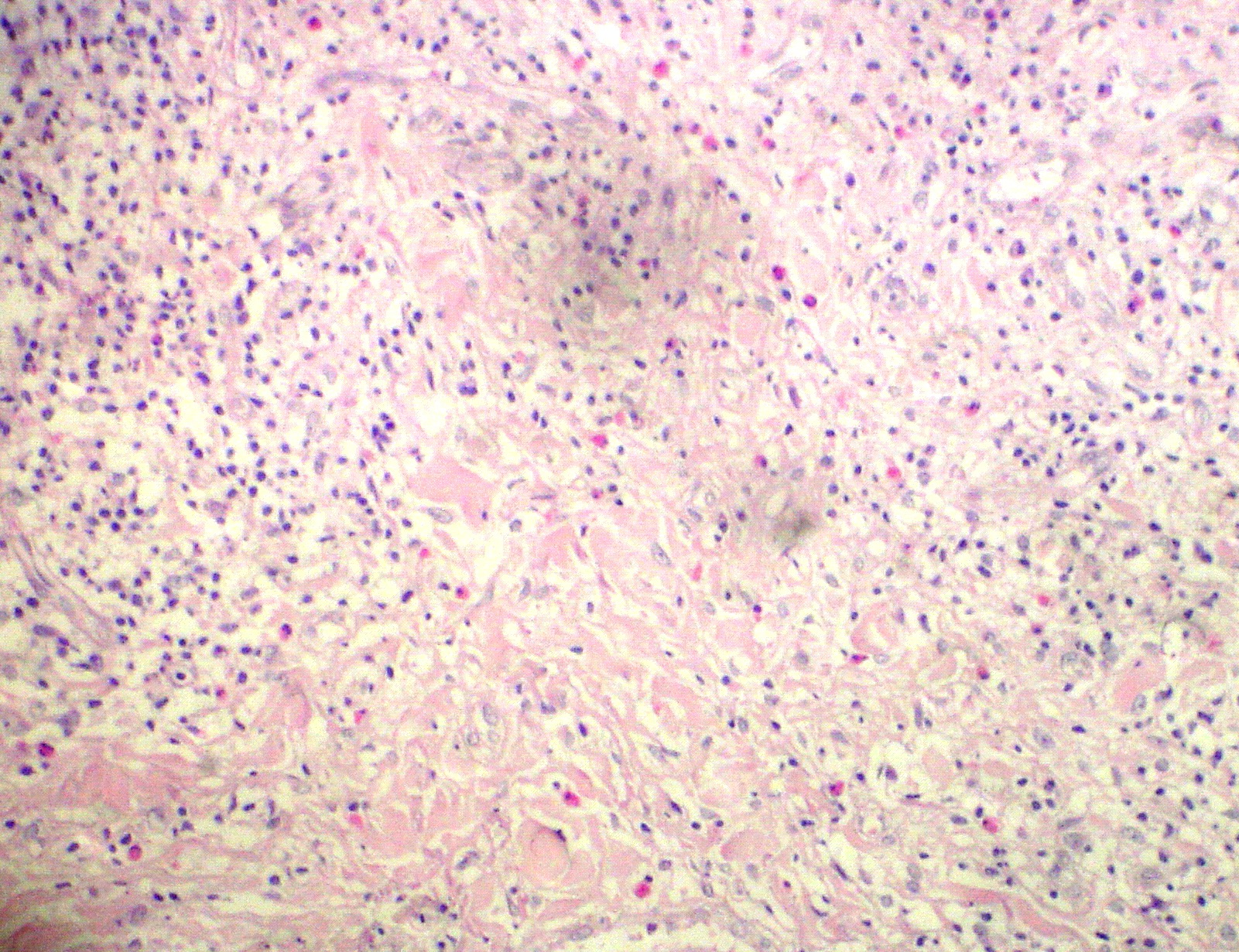 Skin biopsy showed diffuse infiltration by large lymphohistiocytic cells. Some of cells showed lymphophagocytosis [H&E X 12].