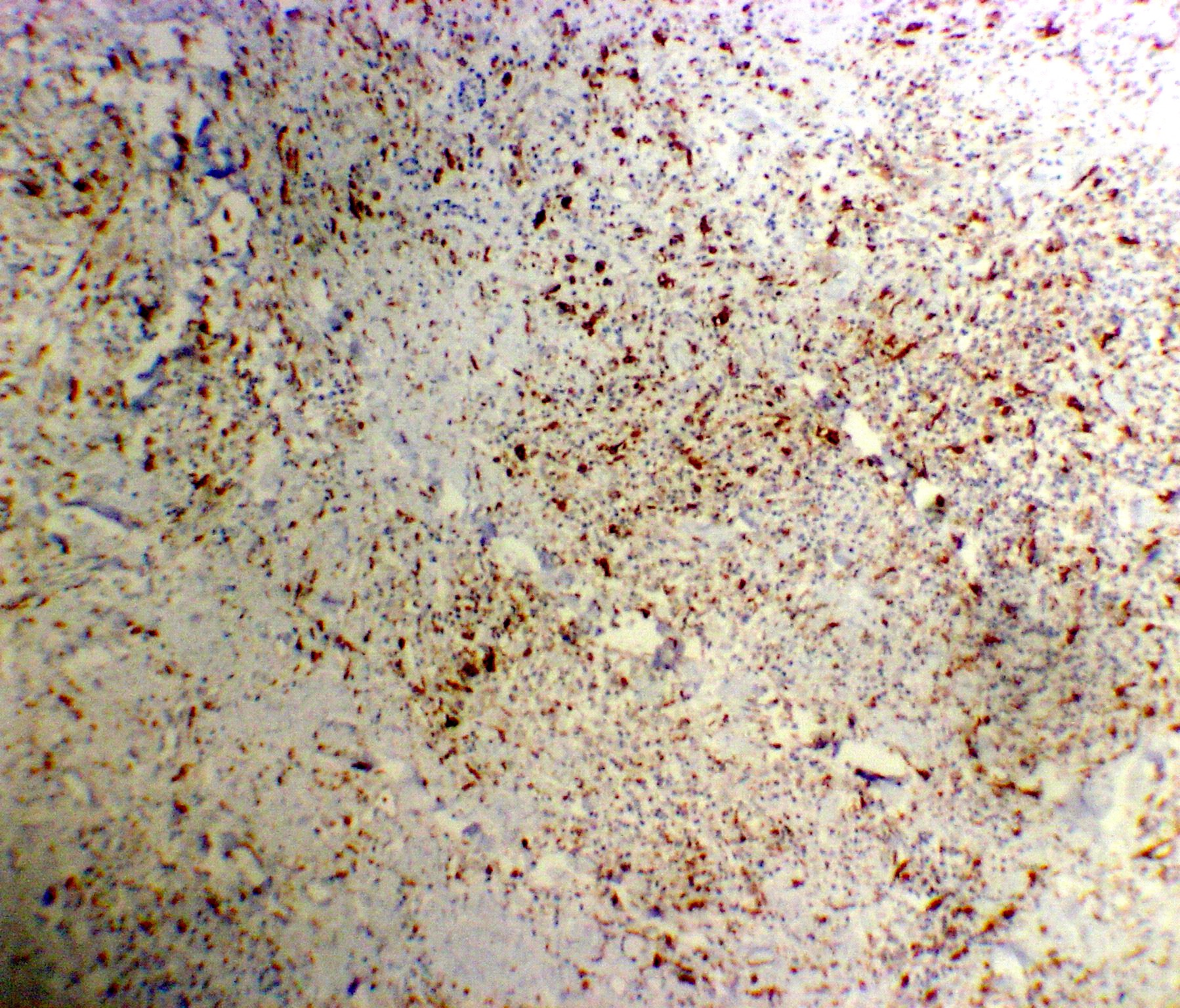 CD68 immunohistochemical stain showed strong diffuse cytoplasmic staining for histiocytes cells [X 160]