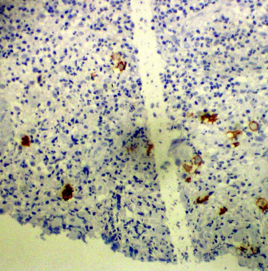 CD 30 immunohistochemical stain showed focal positivity for some cells [X 160]