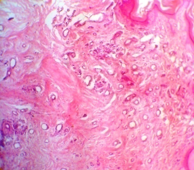 Photomicrograph showing numerous, scattered, dermal, small ducts lined by two rows of epithelial cells ; some of which have epithelial cords with comma-like tails embedded in a sclerotic stroma(H&E x150).