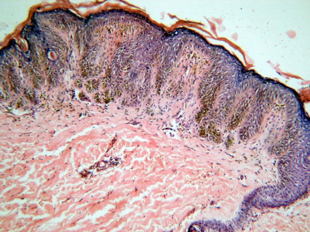 H&E stained section showing hyperkeratosis, acanthosis, papillomatosis and hypermelanosis.
