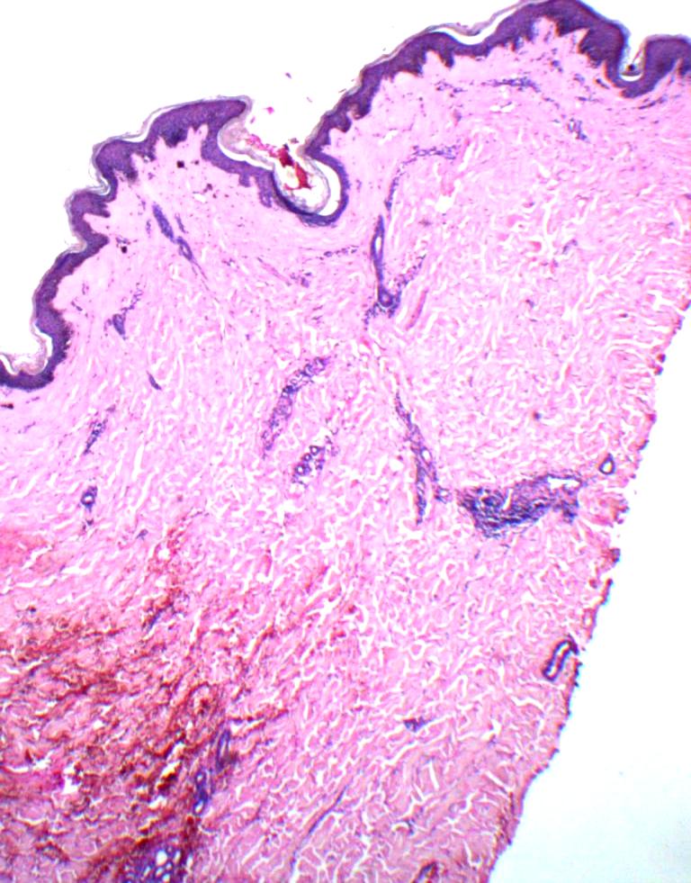 Skin biopsy from thigh lesion showing atrophic epidermis, vacuolar interface and hylinized papillary dermis. (H&E, 40X)