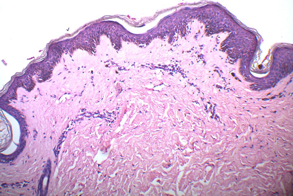 High power view showing hylinized collagen, lymphocytic infiltrate, melanophages and slightly atrophic epidermis with interface. (H&E, 100X)