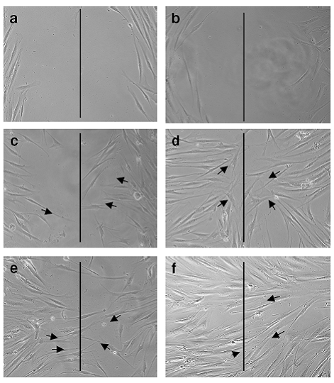 AbstractWound healing is a complex and dynamic process where the cell structures are restored to normalcy. The management of wound is currently by use of antiseptics and antibiotics which usually prevent / treat infection. But the intricate process of wound healing depends on cell migration and proliferation. Fibroblasts are the key cells responsible for initiating angiogenesis, epithelialization and collagen formation. Currently there is a dearth of scientific reports on agents that can facilitate the process of wound healing at cellular level. A polyherbal formulation consisting of extracts of Wrightia tinctoria, Aloe vera, Curcuma longa and Terminalia chebula was used to study the fibroblast cell migration and proliferation using scratch wound assay technique. The results of the study indicate that the polyherbal formulation may be useful in effective management of superficial wounds. Keywords - Wound healing, Fibroblast, Scratch wound assay, Cell migration, Cell proliferation, herbal, Siddha Background Wound or injury to skin can be due to intentional or accidental trauma. When the intact tissue is damaged, cells adjacent to it migrate to the site, proliferate, synthesize matrix components and tend to close the wound. Wound healing is a complex process of cellular and biochemical interactions involving various cells such as keratinocytes, fibroblasts and endothelial cells [1]. The wound healing process passes through four major phases such as hemostasis, inflammation, proliferation and remodeling [2]. The proliferative phase overlaps with the inflammatory phase. The most important cell is fibroblast which is responsible for initiating angiogenesis, epithelialization and collagen formation [3]. Use of antiseptics and antibiotics can only prevent or treat infections. Hence, preparations to augment other inevitable mechanisms responsible for wound healing are of prime importance and need to be explored. Several plant compounds are reported to have enhanced wound healing activity. The glycoprotein fraction from Aloe vera is reported to enhance cell proliferation and migration of keratinocytes thereby act as an effective wound healing agent [4]. The present study evaluates the wound healing effect of a Sidhha preparation (Test formulation) by 3T3 fibroblast cell migration and proliferation by scratch wound assay. A major advantage of this simple assay is that it mimics to some extent in vivo migration of cells. The Siddha preparation used in the present study contains the extracts of selective traditional plants with cell migratory, anti-inflammatory and anti-microbial properties viz. Wrightia tinctoria, Aloe vera, Curcuma longa and Terminalia chebula. This Siddha polyherbal formulation was made in a gel (carbomer) base for the study and is referred to as Thee Gel. Materials and MethodsPreparation of test formulation (Thee Gel): The coconut oil extracts of Wrightia tinctoria was prepared [5]. Propylene glycol extract of Aloe vera pulp, alcoholic extracts of Curcuma longa and Terminalia chebula were prepared separately and used. In brief, the extracts were incorporated into carbomer gel and bees wax base with the help of an emulsifier. The percentages incorporation of different extracts in test formulation are Wrightia tinctoria and Aloe vera at 0.4% and Curcuma longa and Terminalia chebula at 0.08%. Cell culture Mouse fibroblast 3T3 cells were cultured in Dulbecco's modified Eagle's medium (DMEM) containing 10% fetal calf serum, 2 mM glutamine and 100μg/ml each of penicillin and streptomycin and incubated at 5% CO2 at 37°C [1]. Wound healing-migration assay Cells were grown to confluence on a 24-well dish, the medium was aspirated, and serum starved for 24 hours. Fresh medium with or without Test formulation was added. A single stripe (500 μm wide) was scraped on the cell-coated surface with a disposable plastic pipette tip and the wound was allowed to heal for 24 hours. The average extent of wound closure was evaluated by measuring the width of the wound. The speed of migrating cells into the wound area was examined and photographed [6,7]. Cell migration was assessed by microphotography. The fibroblasts were treated with varying concentrations of test formulation and were examined at 12 and 24 hours after treatment. Untreated control, 10nM epidermal growth factor (EGF) treated set for positive reference and placebo treated set were also maintained. Fibroblasts were treated with 5, 10, 25 and 50 μg/ml of Test formulation, incubated for 24 hours. The extent of cell migration was photographed and measured using image analyzing software. Each experiment was performed in triplicate. Cell proliferation assay Fibroblast 3T3 (103) cells were seeded in a 96-well culture plate in a humidified 5% CO2 atmosphere. Cells were serum starved for 24 hours and then incubated with 5, 10, 25 and 50μg/ml of Test formulation and further incubated for 24 hours. After 24 hours 3-(4,5- dimethylthiazol-2-yl)-2,5-diphenyl tetrazolium bromide (MTT) was added and formazan product was dissolved in 100μl of DMSO. Absorbance at 570 nm was measured with microtiter plate reader and cell viability was determined by tryphan blue exclusion method. ResultsCell migration assay Test formulation treatment enhanced the cell migration of 3T3 fibroblasts when tested by scratch wound assay. After 12hr of treatment with 50μg of Test formulation, the migratory nature of the fibroblast could be seen by microscopic examination. Complete covering of the wound was observed within 24 hours of treatment, similar to that of EGF. This response was not recorded either in the cell culture plate maintained as untreated control or placebo treatment (Figure 1).