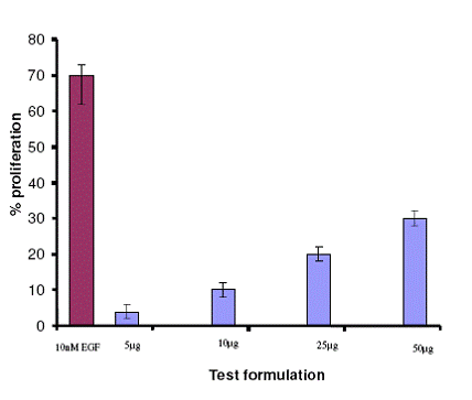Fibroblast proliferation assay An increased proliferation of fibroblast in response to treatment with test formulation was observed. The rate of proliferation was directly proportional to the concentration. However, concentration above 50μg/ml did not greatly influence the proliferation rate. 30% increase in the proliferation of fibroblast in response to test formulation at a concentration of 50μg/ml was demonstrated, whereas in the positive control, EGF showed 70% increase in cell proliferation. Cell proliferation was insignificant in untreated and placebo treated control (Figure 2).