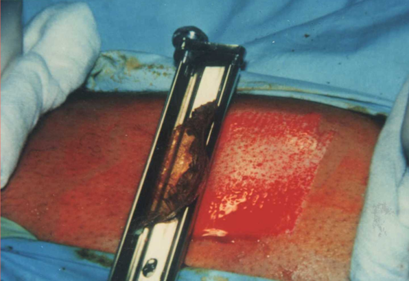 : obtaining the split skin graft with the skin graft knife from the medial aspect of the thigh.
