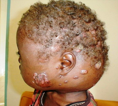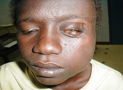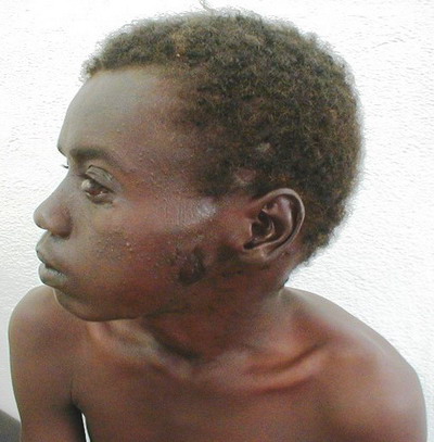AbstractMycetomas are endemic parasitoses in Niger (West Africa) and in other tropical countries. In the literature, the etiological forms (actinomycotic and eumycotic) are described with tumorous lesions in various localizations. In this paper, we report on a giant cephalo-cervical lesion due to a Streptomyces somaliensis actinomycete. This particular localization led during the evolution of the disease to the destruction of the patient's left eye. Ketoconazole was administered with a complete recovery of the lesions. Keywords: Giant cephalocervical mycetoma, Streptomyces somaliensis, Ketoconazole IntroductionThe term mycetoma refers to disease processes where exogenous actinomycotic or eumycotic causative agents produce parasitic grains [1]. Mycetoma is a condition long-known in India that affects the lower limbs. It was first described in 1842 by John Gill in India's Madura Madras area, hence its alternative name as "Madura foot" [2]. Mycetoma causative agents are saprophytes that are widespread in the soil of endemic regions and on thorny shrubs of the Mimosa family in semi-arid climates [3]. Several studies have been done throughout the world [2,4-6] and in Africa, especially in Sub-Saharan Africa [3,7-12]. In Niger, the disease was described for the first time in 1985 [13]. In this paper, we report on a rare case of cephalo-cervical mycetoma due to Streptomyces somaliensis. Case ReportThe patient, AH, is a 20 years old farmer living near the town of Tanout, in a rural area in the North-East of Niger where thorny shrubs are abundant. He was referred to the neurosurgery department of the National Hospital of Niamey (HNN) for cranial swelling and was subsequently sent to the dermatology department. The patient indeed admitted that he has been pricked, cut or bruised many times over in his life by thorns, shreds and tools, and that he always neglected the ensuing little wounds. This is a normal behavior for most farmers working daily in the fields. His illness started 8 months prior to consultation, when two bullous lesions appeared on his left cheek, releasing a yellowish liquid. Later, a swelling occurred on the cheek and spread rapidly to the whole left occipito-temporal area. An April 9, 2003 medical examination showed a left cheek edema extending to the neck, the left temporal region, the left periorbital region, and the right of the posterior auricular area. In these areas, there were several budding lesions, isolated or congregated in plaques (Figure 1). The plaques were erythematous and fistulizing in some places, letting out a purulent liquid and yellow grains.