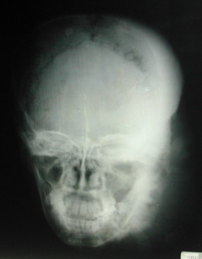 Skull Radiography showed a thinning of the left occipitoparietal vault with osteosclerosis and osteolysis areas and a widening of bone sutures (Figure 2). The osteosclerosis resulted from bone deposits that are perpendicular to the bone surface and extended from the second cervical vertebra to the sphenoid greater wing and the left mandible. The damage to the left eye was probably due to the inoculation of the causative agent in the eye after a trauma on the upper eyelid (Figure 3). However we did not carry out laboratory tests to confirm our observation.