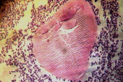 The ultrasound scan of the soft cervical tissue evidenced a dense echogenic body that is somewhat heterogeneous, with no identifiable necrotic or fluid areas, and the limits of which were difficult to ascertain. The dense tissue was in contact with the jugulo-carotid vessels of the neck. Along the branch of the mandible, there was an exophytic reaction from the dense body. Beside the eye damage referred to above and a restriction in the extent of the mouth opening (due to damage to the jaws), electromyogram and electroencephalogram tests showed no other sensory or motor abnormalities. The histopathological examination of a biopsy specimen led to the etiological diagnosis involving an actinomycete: the Streptomyces somaliensis (Figure 4). The Gomori-Grocott stain allowed the elimination of mycelium filaments and false mycoses. Although mycological cultures may add more certainty in the identification of the causative agent, we considered that the histopathological tests carried out were unambiguous in this respect.
