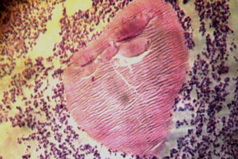 Streptomyces somaliensis actinomycotic granule (center of picture, H and E stain; x 10)