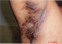 Treatment: Treatment of HS is challenging. Although there are various treatment options for HS, none of the traditional therapies is wholly satisfactory or uniformly effective. Therapy varies based on the on the clinical severity of the disease, although there is considerable overlap between treatment groups. Mainstays of treatment are non-steroidal anti-inflammatory drugs for pain and inflammation, antiseptics, antibacterial soaps, warm compresses, hydrotherapy, and antibiotics. Medical treatments can reduce inflammation and associated tenderness and drainage, but usually do not halt disease progression. Medical therapy can be divided into topical and systemic. Clindamycin 1% solution twice daily for 12 weeks helps in resolving abscesses and pustules [29]. Systemic medications can be further divided into antibiotics, retinoids, hormonal modulators, and immunosuppressants. Antibiotics can be helpful, particularly if specific organisms can be demonstrated. However, antibiotics require fairly long courses of therapy. Oral tetracyclines, clindamycin, rifampicin and minocycline have been tried. In a case series of 14 patients receiving oral clindamycin 300 mg twice daily and rifampicin 300 mg twice a day for 10 weeks achieved remission in 8 of the 14 patients. Remission was induced in 2 additional patients when minocycline was substituted for clindamycin[30]. Results from systemic retinoids, particularly isotretinoin, have proven to be disappointing. A prospective trial with long term follow-up showed that only 23% of HS patients benefit from isotretinoin 0.5 to 1 mg/kg and only 16% of patients showed durable remission after treatment[31]. Antiandrogen therapy has been studied in HS. Cyproterone acetate and spironolactone need further study to define their role in treating HS. Finasteride, a 5-alpha reductase inhibitor, 5 mg once a day showed improvement by 8 weeks and remissions from 8 to 18 months [32]. Immunosupressive therapy has been used in HS particularly in acute inflammatory stage with varying degrees of success. Dapsone, cyclosporine, azathioprine, mycophenolate mofetil, tacrolimus have been tried. Biologicals like TNF-alpha inhibitors (infliximab, etarnecept, adalimumab) and T-cell specific agents (alefacept and efalizumab) for the treatment of HS have thus far proved to have variable long-term results and are laden with significant adverse effects. However, the use of three anti-TNF biologic agents might be considered a potentially life-altering maneuver [33,34,and35]. Non-surgical modalities like cryotherapy, carbon-dioxide laser and photodynamic therapies have been tried but none of them have proved to be satisfactory. Radiotherapy with x-rays has been reported to be useful in control of the disease [36]. Surgical excision is the treatment of choice for early disease. Surgical techniques for excision and repair vary, depending on extent of disease, location of the lesions, existing comorbidities, and chronicity of disease [37]. Differential Diagnosis: Possible misdiagnoses are numerous, and vary with the stage and site. Axillary and inguinal lesions that have ulcerated may be confused with scrofuloderma. Inguinal lesions may simulate actinomycosis, granuloma inguinale or lymphogranuloma venereum. When only one or a few nodules and sinuses are present in the anogenital region, pilonidal sinus, sigmoidal diverticulitis and Crohn's disease must be excluded. In atypical cases, the diagnosis may be difficult. The characteristic comedones should be sought and the non-specific histological changes may be negatively useful. References1. Verneuil A. NonEnl'Hidrosadenite Phlegmoneuse Et Des Abces Sudoripares. Arch Gen Med 1864;24:537-57. 2. Brown TJ, Rosen T, Orengo IF. Hiradenitis suppurativa. South Med J 1998;91:107-14 . 3. Wiseman MC. Hidradenitis suppurativa: a review. Dermatol Ther 2004;17;50-4 . 4. Krebc AC. Current understanding and management of hiradenitis suppurativa. J Am Acad Nurse Pract 2007;19:228-34 . 5. Ather S, Chan DS, Leaper DJ et al. Surgical treatment of hiradenitis suppurativa: case series and review of literature. Int Wound J 26;3:159-169 . 6. Edlich RF, Silloway KA, Rodeheaver GT, et al. Epidemiology, pathology and treatment of axillary hidradenitis suppurativa. J Emerg Med 1986;4:369-78 . 7. Jemec GB, Heidenheim M, Nielsen NH. Hidradenitis suppurativa-characteristics and consequences. Clin Exp Dermatol 1996;21:419-23 . 8. Harrison BJ, Read GF, Hughes LE. Endocrine basis for the clinical presentation of hidradenitis suppurativa. Br J Surg 1988;75:972-5 . 9. Konig A, Lehmann C, Rompel R, et al. Cigarette smoking as a triggering factor of hidradenitis suppurativa. Dermatology 1999;198:261-4 . 10. Freiman A, Bird G, Metelista AI, et al. Cutaneous effects of smoking. J Cutan Med Surg 2004;8:415-23 . 11. Marinella MA. Lithium therapy associated with hidradenitis suppurativa. Acta Derm Venereol 1997;77:483 . 12. Gupta AK, Knowles SR, Gupta MA, et al. Lithium therapy associated with hidradenitis suupurativa: case report and a review of the dermatologic side effects of lithium. J Am Acad Dermatol 1995;32:382-6 . 13. 13. Mahe E, Morelson E, Lechaton S, et al. Cutaneous adverse events in renal transplant recipients receiving sirolimus-based therapy. Transplantation 2005;79:476-82 . 14. Harrison BJ, Kumar S, Read GF, et al. Hidradenitis suppurativa : evidence for an endocrine abnormality. Br J Surg 1985;72:1002-4 . 15. Von Der Werth JM, Williams HC, Reburn JA. The clinical genetics of hidradenitis suppurativa revisited. Br J Dermatol 2000;142:947-53 . 16. Gao M, Wang PG, Cui Y, et al. Inversa acne (hidradenitis suppurativa) : a case report and identification of the locus at chromosome 1 p21. 1-1q25.3. J Invest Dermatol 2006;126:1301-6 . 17. Manitz L, Betz RC, Allam JP, et al. Keratitis-ichthyosis-deafness syndrome in association with follicular occlusion triad. Eur J Dermatol 2005;15:347-52 . 18. Ozyemisci-Taskiran O, Bolukbasi N, Gogus F. A hidradenitis suppurativa related 