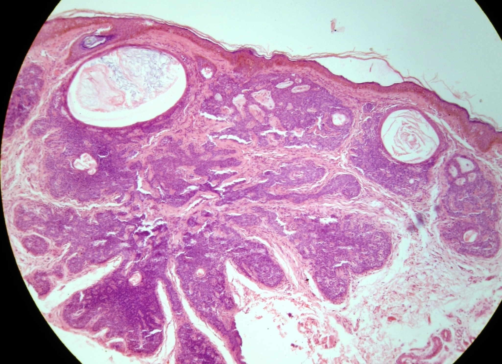 Histopathology showing lobules of small, dark basaloid cells, with peripheral palisading surrounding a central area of eosinophilic amorphous material (H&E X 40).
