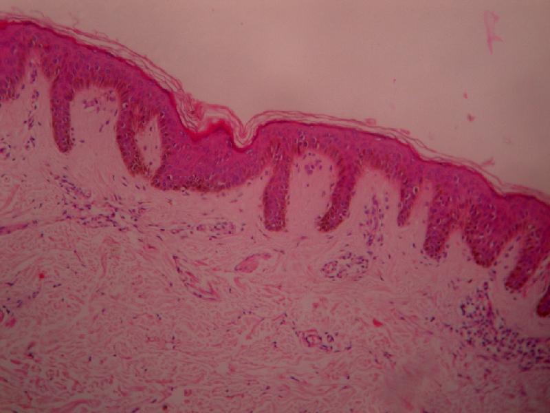 : Histopathological examination revealing elongation of rete ridges with increased melanocytes in the basal layer.(H&E 10X)