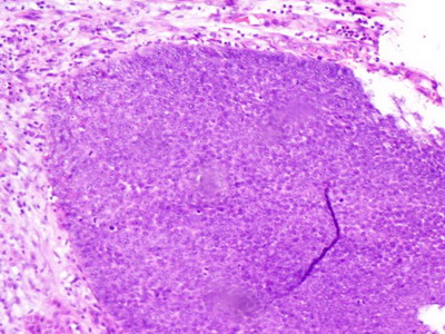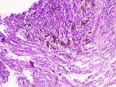IntroductionBasal cell carcinoma (BCC) may exhibit diverse differentiation. In BCC with matrical differentiation, islands of shadow cells are located within the tumor. Shadow cells, characterized by basaloid squamous cells with a distinct well-defined border and a central unstained area as a shadow of lost nuclei, are characteristic of pilomatricoma, a distinct neoplasm of hair matrix differentiation. The presence of shadow cells within tumor islands composed of follicular germinative cells of an otherwise classic basal cell carcinoma (BCC) has been considered as a distinct diagnostic category of BCC with matrical differentiation. A unique variant of basal cell carcinoma with matrical differentiation. This variant of basal cell carcinoma is extremely rare with less than 15 case reports being reported in literature. It is very important to differentiate BCC with matrical differentiation from other conditions where shadow cells are seen as the clinical management is different. We report a rare case of basal cell carcinoma with matrical differentiation in a 68 year old male and review of the literature. Case ReportA 68- year male patient presented with pigmented growth on the leg which had been present since 3 months, but started itching and oozing since a month. On clinical examination, a 2 x 1.5 cms nodular ulcerated pigmented growth with irregular margins was seen. The lesion was surgically excised with a clinical diagnosis of squamous cell carcinoma. The H&E-stained sections of the lesion revealed tumor composed of basaloid follicular germinative cells (Fig 1). In some areas, there was peripheral palisading and stromal retraction artifact typical of classic BCC. Mitotic figures and apoptotic bodies were present. Many of the tumor cells were heavily encrusted with melanin in the cytoplasm (Fig 2). Elsewhere, the majority of the tumor contained a population of shadow cells having only ghost outlines of the cells without nuclei, similar to those seen in pilomatricoma, with basaloid-appearing matrical cells in the periphery (Fig 3, Fig4). Foci of abrupt keratinisation and calcification suggestive of follicular differentiation were seen. A diagnosis of pigmented basal cell carcinoma with matrical differentiation was made. DiscussionShadow cells, characterized by basaloid squamous cells with a distinct well-defined border and a central unstained area indicating the shadow of lost nuclei, are reminiscent of the matrical portion of the hair follicle and characteristic of pilomatricoma, or its rare malignant counterpart, pilomatrix carcinoma.[1] However, shadow cells are non-specific and have been reported in a variety of other conditions, including the hair shafts of alopecia areata, follicular cysts, benign adnexal tumors like trichoblastoma, trichoepithelioam, keratoacanthoma, as well as adnexal carcinomas.[2] The presence of shadow cells within tumor islands composed of follicular germinative cells of an otherwise classic basal cell carcinoma (BCC) has been considered as a distinct diagnostic category of BCC with matrical differentiation.[3,4] Basal cell carcinoma with matrical differentiation is an extremely rare variant of BCC. As of 2008, a report of two new patients and review found only 12 prior cases of BCC showing matrical differentiation had been reported.[3] The morphological and immunohistochemical features found suggest that basal cell carcinomas with matrical differentiation belong to a spectrum of lesions derived from hair follicles in which beta-catenin plays an important role in the tumor development, differentiation, and behavior.[3] Matrical basal cell carcinoma should be differentiated histologically from other tumors, particularly a pilomatricoma and pilomatrix carcinoma.[5] This distinction can be challenging but is critical as pilomatrix carcinoma can metastasize and cause considerable morbidity and mortality while BCC with matrical differentiation behaves no differently than other BCCs.[6] Absence of prominent nucleoli and only rare mitotic figures argue against pilomatrical carcinoma in this instance. ConclusionBCC with matrical differentiation is a distinct pathologic entity and a rare subtype of BCC featuring shadow and matrical cells, typically seen in pilomatricoma, a benign hair matrix neoplasm. These cases often present a diagnostic challenge due to confusion with pilomatrixoma or pilomatrix carcinoma. References1. Kwittken J. Shadow cell basal cell carcinoma with acantholysis. Cutis 2002; 69: 57, 63. 2. Zamecnik M, Michal M. Shadow cell differentiation in tumours of the colon and uterus. Zentralbl Pathol 1995;140: 421. 3. Del Sordo R, Cavaliere A, Sidoni A. Basal cell carcinoma with matrical differentiation: expression of beta-catenin [corrected] and osteopontin. Am J Dermatopathol. 2007 5:470-4. Erratum in: Am J Dermatopathol. 2008; 30:317. 4. Ali F, Brown A, Gottwald L, Thomas J. Basal cell carcinoma with matrical differentiation in a transplant patient: a case report and review of the literature. J Cutan Pathol. 2005; 32:445-8. 5. Kim SH, Lee MG, Lee KG. Basal cell carcinoma with matrical differentiation. Yonsei Med J. 2003; 44:523-5. 6. Haskell HD, Haynes HA, McKee PH, et al. Basal cell carcinoma with matrical differentiation: a case study with analysis of beta-catenin. J Cutan pathol 2005; 32:245-50. © 2013 Egyptian Dermatology Online Journal |