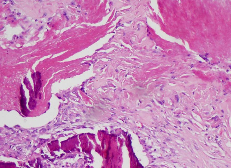 Photomicrograph showing islands of shadow cells, with foci of calcification surrounded by basaloid cells (H&E, 200X).