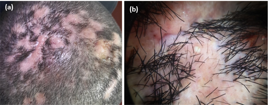 dermoscopic image (non contact, polarized, 30x) showing hair tufting & pustules.